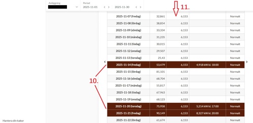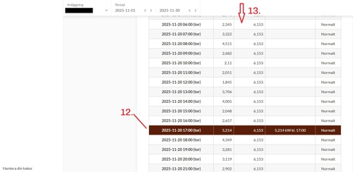 11. I denna kolumnen så visas medelvärdet av de tre effekttopparna, det som blir effektvärdet för månaden.