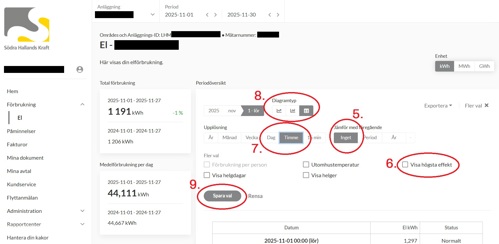 På Mina sidor kan du enkelt se vilka tidpunkter under månaden du har haft högst effektuttag. Det hjälper dig att förstå hur din elanvändning påverkar din effektavgift.