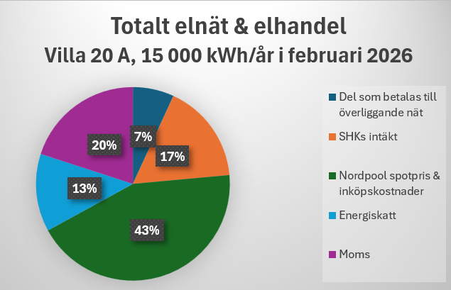 Många undrar hur elräkningen är uppbyggd. Därför har vi brutit ner en faktura i ett diagram som visar hur kostnaderna fördelas för en villa med 20 A säkring och 15 000 kWh/år (februari 2026).